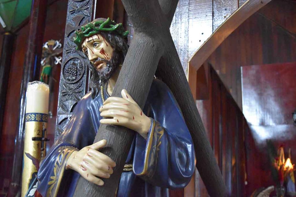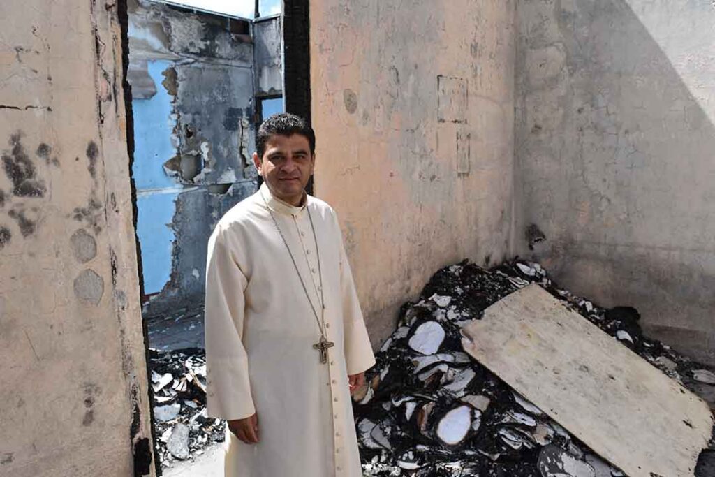 Đức Cha Rolando José Alvarez Lagos, Giám mục Địa phận Matagalpa, trong đống đổ nát của cơ sở Caritas Sebaco, bị thiêu hủy bởi những người ủng hộ Daniel Ortega (Ảnh: ACN)