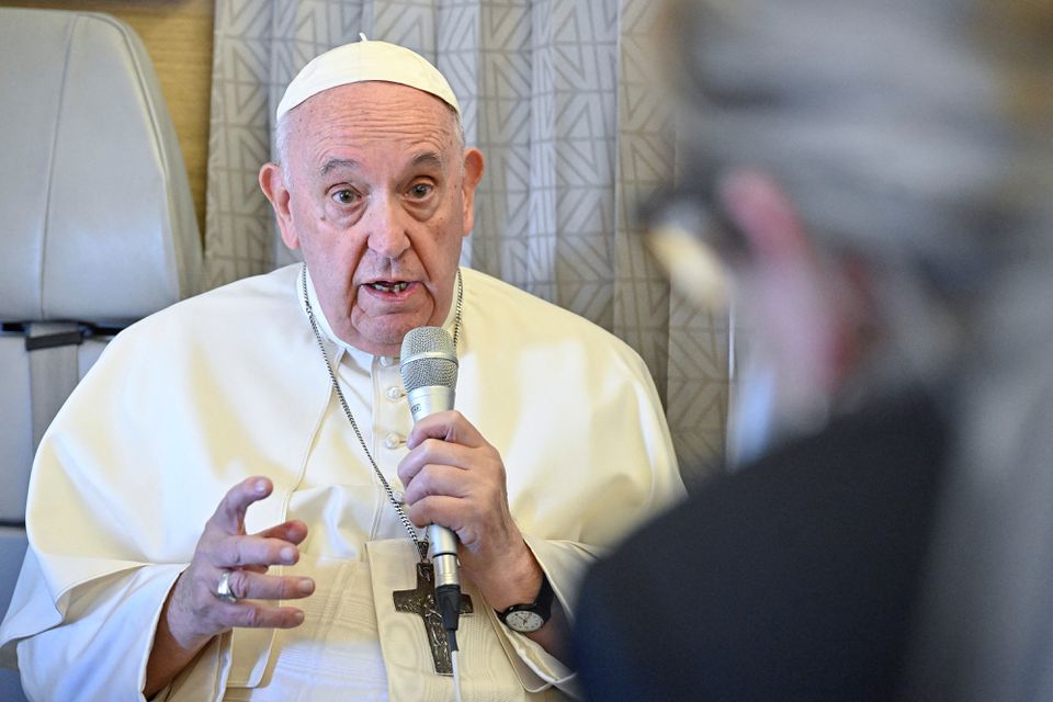 Đức Thánh Cha Phanxicô trả lời các câu hỏi của các phóng viên trong một cuộc hội thảo trên chuyến bay Giáo hoàng trở về Rôma sau khi thăm Nur-Sultan, Kazakhstan, ngày 15 tháng 9 năm 2022 (Ảnh: Alessandro Di Meo / POOL via REUTERS)