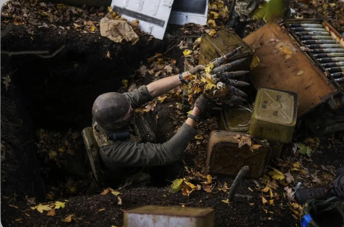 Một công nhân phá mìn bảo vệ lãnh thổ Ukraine lấy đạn dược của Nga bị bỏ lại khi nhóm của anh rà phá bom mìn gần làng Hrakove, Ukraine, thứ Năm, ngày 13 tháng 10 năm 2022 (Ảnh: AP Photo / Francisco Seco)