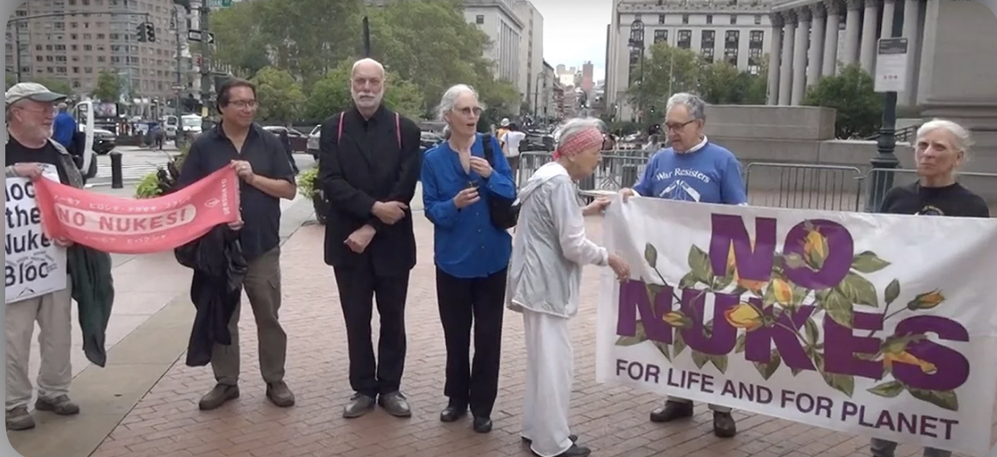 Đây là bức ảnh chụp các nhà hoạt động vì hòa bình ở thành phố New York vào ngày 22 tháng 8 năm 2022, sau khi hầu tòa. Họ bị bắt vào ngày 2 tháng 8 với cáo buộc có hành vi gây rối vì chặn cửa của Phái bộ Hoa Kỳ tại Liên Hợp Quốc. Hành động bất tuân dân sự của các nhà hoạt động được thực hiện khi các nhà ngoại giao gặp gỡ nhau tại Liên hợp quốc tại hội nghị đánh giá về Hiệp ước Không phổ biến vũ khí hạt nhân (Ảnh: Hành động Hòa bình Bang New York/ CNS)