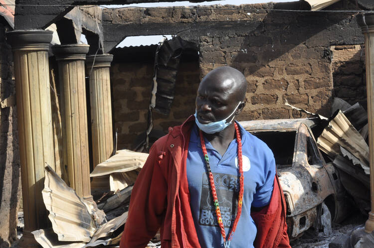 Một người đàn ông đứng trước ngôi nhà bị thiêu rụi sau vụ tấn công của các tay súng ở Bokkos, miền trung bắc Nigeria, vào ngày 26/12/2023 (Ảnh: AP)