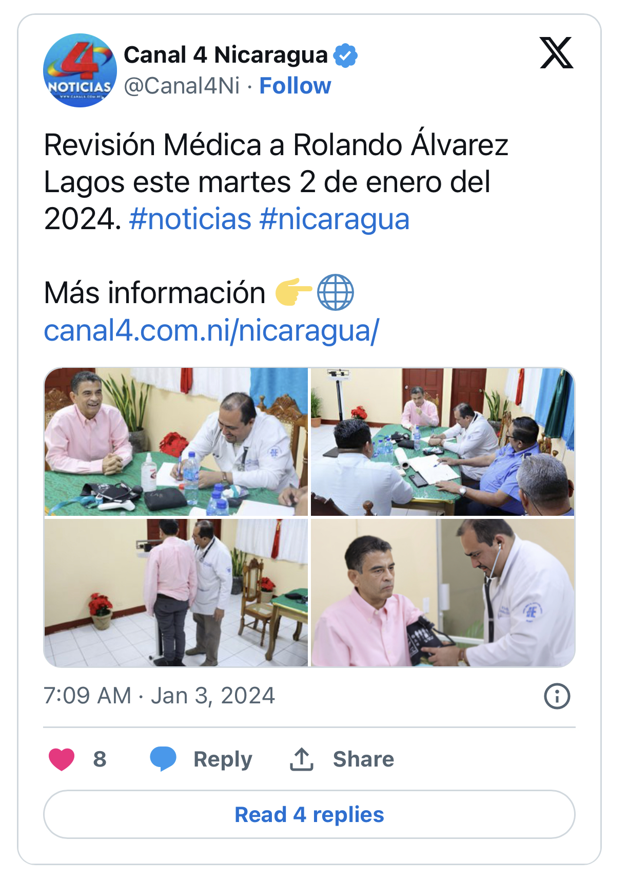 Trong một tuyên bố chính thức, chính phủ Nicaragua đã công bố nhiều bức ảnh khác nhau ghi lại cuộc kiểm tra y tế được thực hiện vào ngày 2 tháng 1 đối với Đức Giám mục Álvarez, người đã bị giam giữ hơn 500 ngày. Vị Giám chức này đã bị quản thúc tại gia vào tháng 8 năm 2022, và vào tháng 2 năm 2023, ngài bị chế độ độc tài kết án 26 năm 4 tháng tù vì cáo buộc phản quốc.