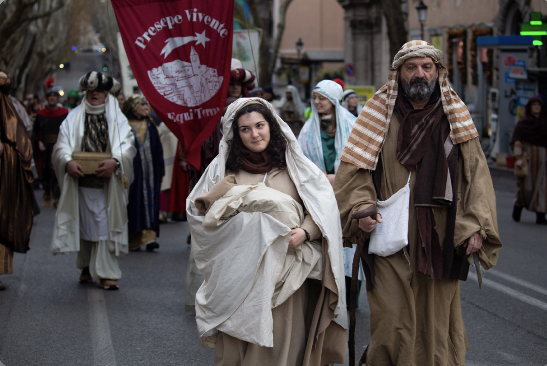 Các gia đình ăn mặc như những người thợ thủ công La Mã truyền thống, binh lính La Mã và các nhân vật khác trong câu chuyện về sự ra đời của Chúa Giêsu cũng tham gia cuộc diễu hành.