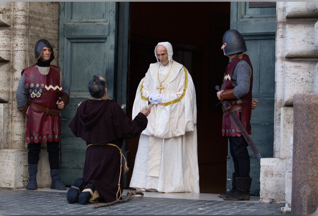 Hoạt cảnh Giáng Sinh bắt đầu với việc tái hiện việc Đức Giáo hoàng Innôcentê III phê chuẩn quy tắc cho Dòng Phan Sinh do Thánh Phanxicô Assisi viết và đệ trình.