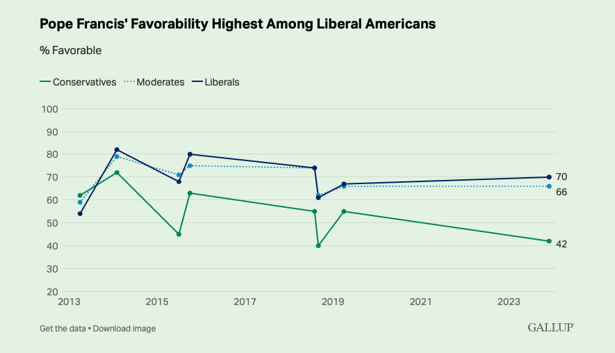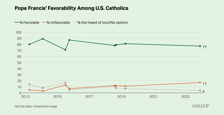 Theo cuộc thăm dò mới nhất của Gallup được thực hiện từ ngày 1 đến ngày 20 tháng 12 năm 2023, mặc dù vẫn duy trì nhận thức chủ yếu là tích cực ở Hoa Kỳ, nhưng Đức Thánh Cha Phanxicô vẫn phải đối mặt với một số thách thức về sự tán thành.