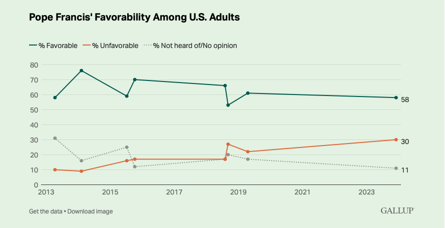 Tỷ lệ ủng hộ Đức Thánh Cha Phanxicô đối với người Mỹ nói chung là 58%, một con số mặc dù vững chắc nhưng lại thuộc hàng thấp nhất kể từ khi ngài nhậm chức vào năm 2013. Đáng ngạc nhiên là tỷ lệ không tán thành đối với ngài đã đạt mức cao mới là 30%.