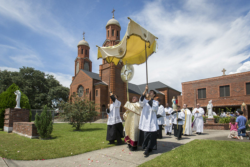 Cha Michael Champagne kiệu Mình Thánh Chúa từ Trung tâm Borel tại Nhà thờ Công giáo St. Bernard ở Breaux Bridge, La., thuộc Giáo phận Lafayette (Ảnh: CNS / Tim Mueller)
