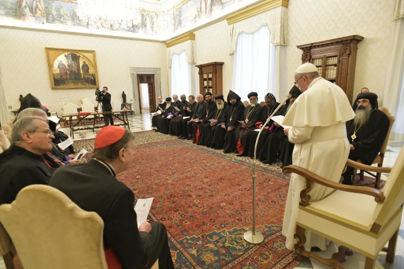 “Ngọt ngào tốt đẹp lắm thay, anh em được sống vui vầy bên nhau” (Tv 133, 1). Với những lời này được trích từ Thánh Vịnh, tôi xin gửi đến các anh em huynh đệ lời chào thân ái và tôi cũng cảm ơn các huynh đệ vì đã cam kết bước đi trên con đường của sự hiệp nhất và đã làm tất cả với tinh thần huynh đệ! Tôi rất vui mừng, cứ mỗi năm thứ hai, được chào đón các huynh đệ đến Rome nhân dịp cuộc đối thoại của các huynh đệ vào năm ngoái được tổ chức tại Tòa Thượng Phụ Etchmiadzin theo lời mời của Giáo hội Tông Truyền Armenia. Thông qua các huynh đệ, tôi xin gửi lời chào đến các vị Hiền Huynh đáng kính và thân mến của tôi, những người đứng đầu các Giáo hội Chính thống Đông phương. Tôi vô cùng biết ơn những lời tốt đẹp của Đức Giám mục Kyrillos, tân Đồng Chủ tịch của Ủy ban, người mà tôi luôn nhớ đến qua những lời cầu nguyện của tôi cũng như những lời chúc tốt đẹp nhất cho công việc của ngài. Với tâm tình biết ơn, tôi cũng nhớ đến vị tiền nhiệm của ngài, Đức TGM Anba Bishoy, người cũng là đồng chủ tịch đầu tiên và vừa mới qua đời. Tôi cũng xin cùng hiệp ý với các huynh đệ để cùng nhau cầu nguyện ngài.