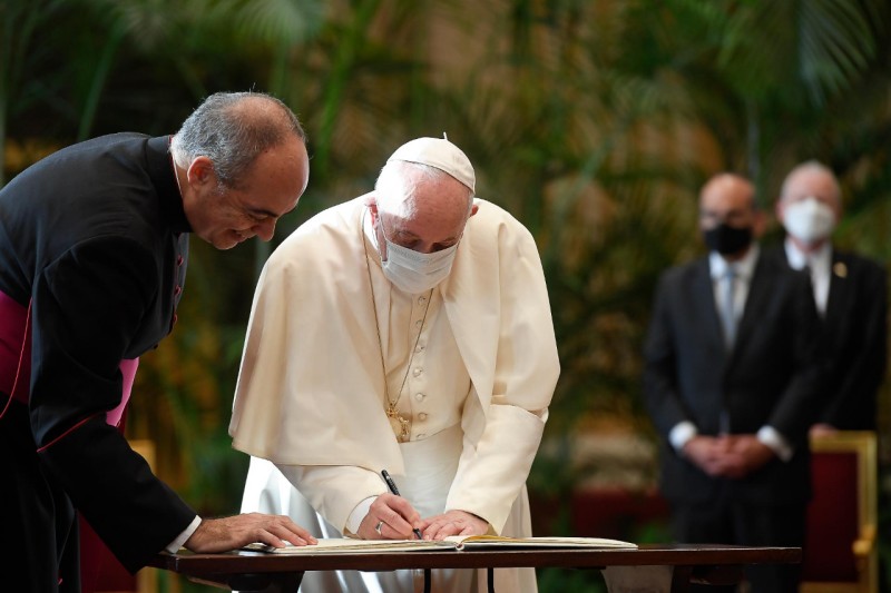 Đức Thánh Cha Phanxicô đã trình văn bản đã ký cho Alok Sharma, Chủ tịch Hội nghị về Biến đổi khí hậu của Liên hợp quốc năm 2021 (COP 26), và Bộ trưởng Ngoại giao Ý Luigi Di Maio.