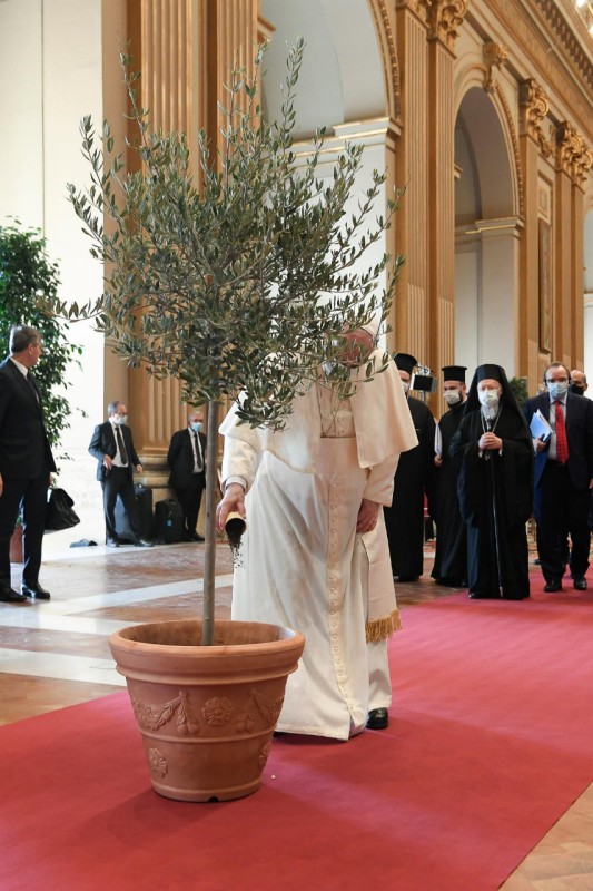 Các nhà lãnh đạo tôn giáo tham dự sự kiện hôm thứ Hai mỗi người đổ một cốc đất vào một chậu cây ô liu vốn sẽ được trồng trong Vườn Vatican.
