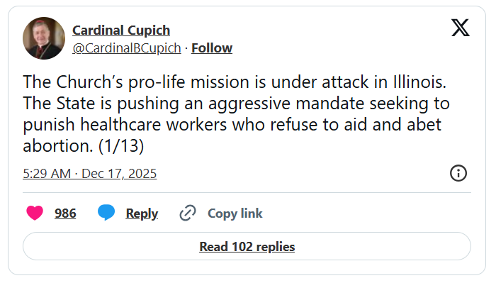 Đức Hồng Y Blase Cupich Địa phận Chicago và các giáo sĩ khác từ tiểu bang Illinois cho rằng luật của tiểu bang yêu cầu các chuyên gia chăm sóc sức khỏe phản đối phá thai phải giới thiệu bệnh nhân đến các nhà cung cấp dịch vụ khác và thảo luận về cái gọi là “lợi ích” của việc phá thai là hành vi vi phạm sứ mạng của Giáo hội.