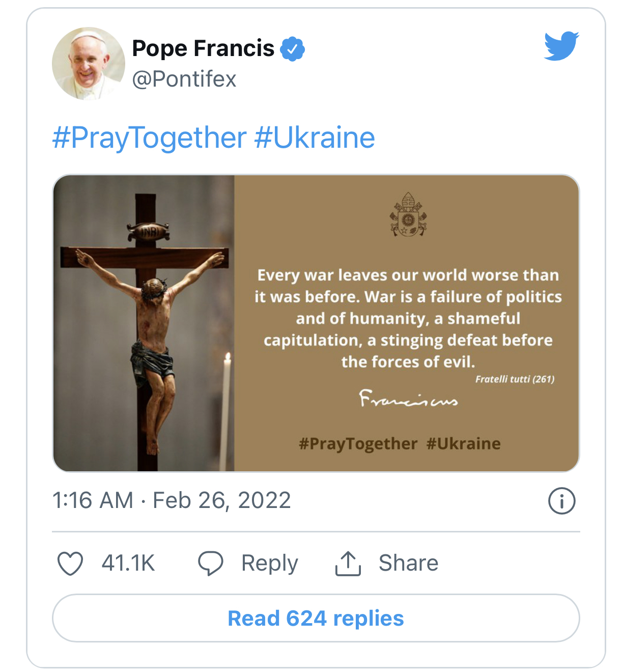 Đức Thánh Cha Phanxicô đảm bảo với Đức Tổng Giám mục Shevchuk về sự gần gũi, ủng hộ và những lời cầu nguyện của ngài cho Ukraine. Đức Thánh Cha cũng gửi Phép lành Tòa Thánh đến những người dân Ukraine đang đau khổ.