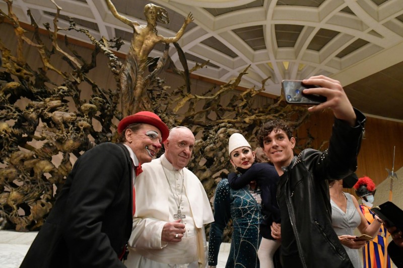Một nhóm biểu diễn xiếc đến từ Rạp xiếc Rony Roller ở Rôma đã bước lên sân khấu với tiếng nhạc lớn và những chiếc dùi cui rực lửa ngay trước khi Đức Thánh Cha cùng với những người hành hương đọc Kinh Lạy Cha để kết thúc buổi tiếp kiến chung.