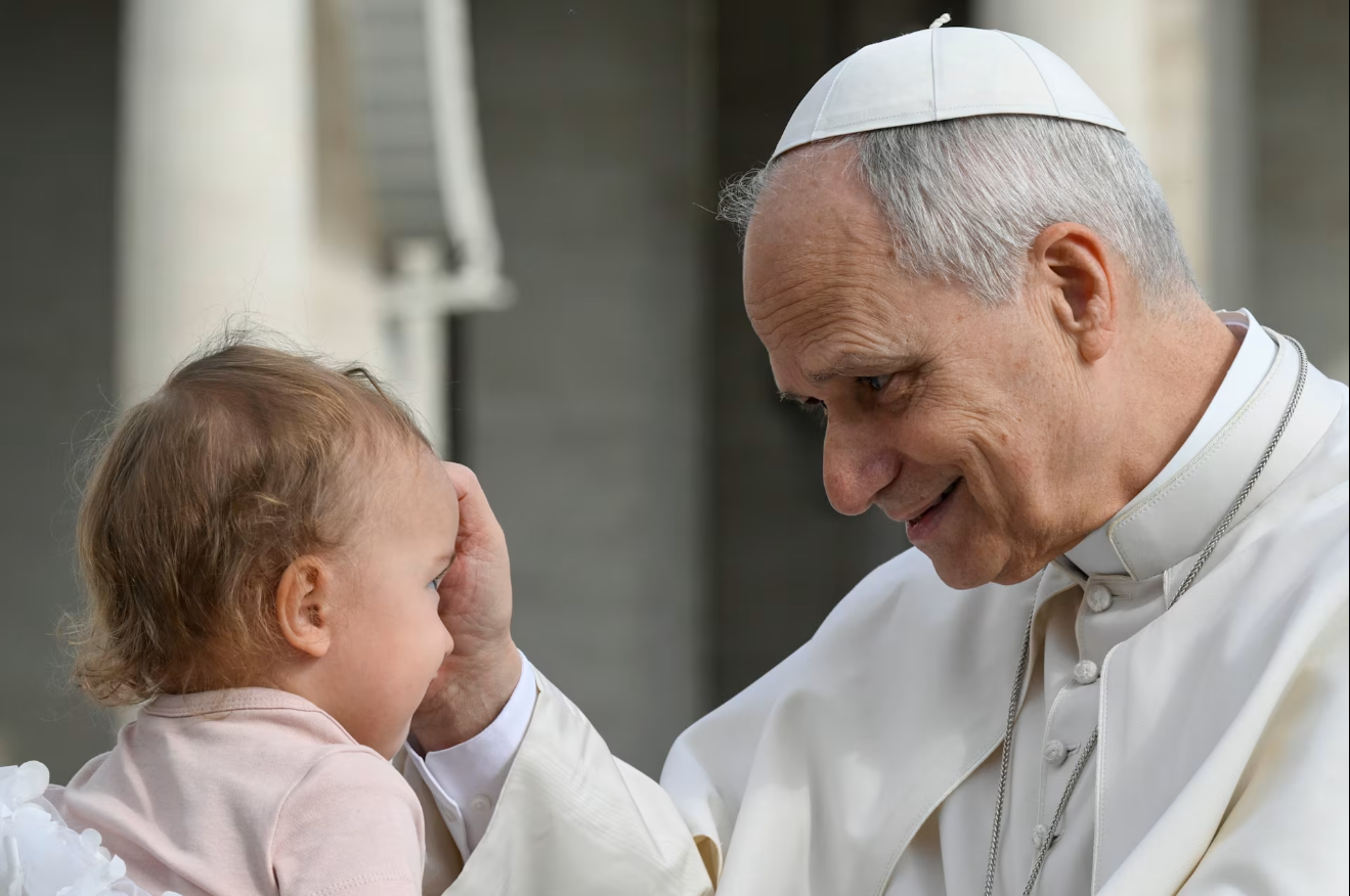 Đức Thánh Cha Lêô XIV chúc lành cho một em bé trong buổi tiếp kiến chung tại Quảng trường Thánh Phêrô vào ngày 11 tháng 3 năm 2026 (Ảnh: Truyền thông Vatican)