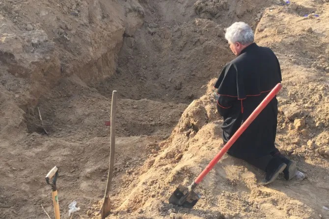 Đặc phái viên của Đức Giáo hoàng, Đức Hồng y Konrad Krajewski cầu nguyện tại một ngôi mộ tập thể ở Ukraine vào Thứ Sáu Tuần Thánh, ngày 15 tháng 4 năm 2022 (Ảnh: Truyền thông Vatican)