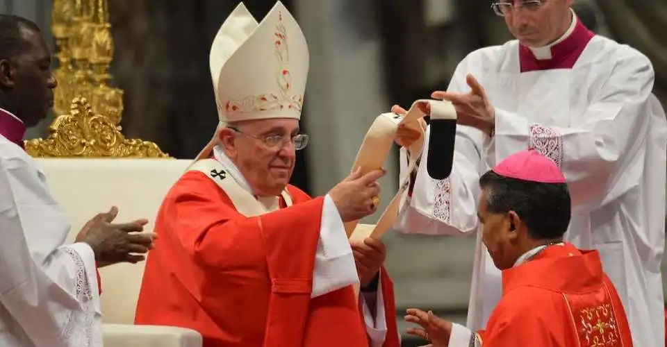 Đức tân Tổng Giám mục Địa phận Pontianak (Indonesia), Đức Cha Agustinus Agus, nhận dây Pallium từ Đức Thánh Cha Phanxicô trong Thánh lễ dành cho các tân Tổng Giám mục thủ đô và Lễ trọng kính hai Thánh Phêrô và Phaolô vào ngày 29 tháng 6 năm 2014, tại Vương cung Thánh đường Thánh Phêrô ở Vatican (Ảnh: VINCENZO PINTO/AFP)