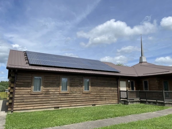 Nhà thờ Thánh Gia ở Booneville, Kentucky, với các tấm pin mặt trời được lắp đặt như một phần trong mục tiêu phát thải ròng bằng 0 của Giáo phận Công giáo Lexington (Ảnh do Giáo phận Công giáo Lexington, Kentucky cung cấp)