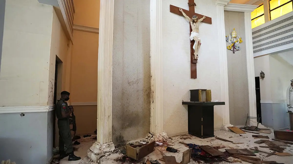 Một sĩ quan cảnh sát đứng gác bên trong Nhà thờ Công giáo Thánh Phanxicô, một ngày sau vụ tấn công nhắm vào các tín hữu ở Owo, Nigeria, thứ Hai, ngày 6 tháng 6 năm 2022. Các tay súng đã giết hại 50 người tại một nhà thờ Công giáo ở tây nam Nigeria đã nổ súng vào các tín hữu cả bên trong lẫn bên ngoài tòa nhà trong một vụ tấn công phối hợp trước khi tẩu thoát khỏi hiện trường (Ảnh: AP/Sunday Alamba)