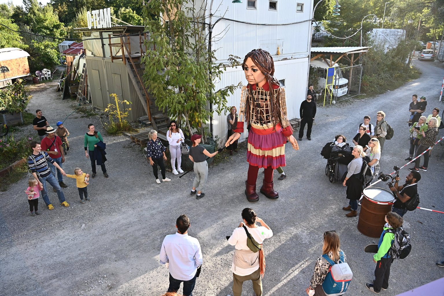 Người dân tập trung xung quanh “Little Amal”, một con rối cao lớn hình một cô gái trẻ tị nạn người Syria, ở Stuttgart, Đức, ngày 1 tháng 10 năm 2021. Con rối được rước đi khắp châu Âu từ Thổ Nhĩ Kỳ đến Anh để nâng cao nhận thức về hoàn cảnh của những người tị nạn trẻ tuổi (Ảnh: Lukas Barth / Reuters qua CNS)