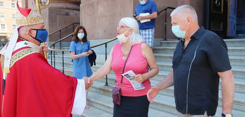 Đức Tổng Giám mục Nelson J. Pérez Địa phận Philadelphia chào đón anh chị em giáo dân sau Thánh lễ vào ngày 23 tháng 5 năm 2021, bên ngoài Vương Cung Thánh Đường Thánh Phêrô và Thánh Phaolô. Đức Thánh Cha Phanxicô đang mời gọi các tín hữu Công giáo cả trong xu thế chủ đạo của đời sống Giáo hội lẫn những người bên lề hãy nói lên những ước mơ, ý tưởng và mối bận tâm của họ để chuẩn bị cho Thượng hội đồng Giám mục vào năm 2023 (Ảnh CNS / Sarah Webb, CatholicPhilly.com)