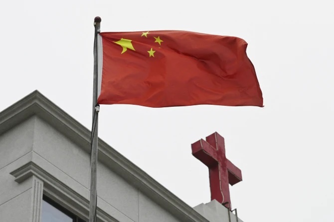 Bức ảnh này được chụp vào ngày 15 tháng 1 năm 2024, cho thấy một lá cờ Trung Quốc tung bay bên dưới cây Thánh giá trên một nhà thờ Kitô giáo ở Bình Đàm, tỉnh Phúc Kiến, đông nam Trung Quốc (Ảnh: GREG BAKER/ AFP qua Getty Images)