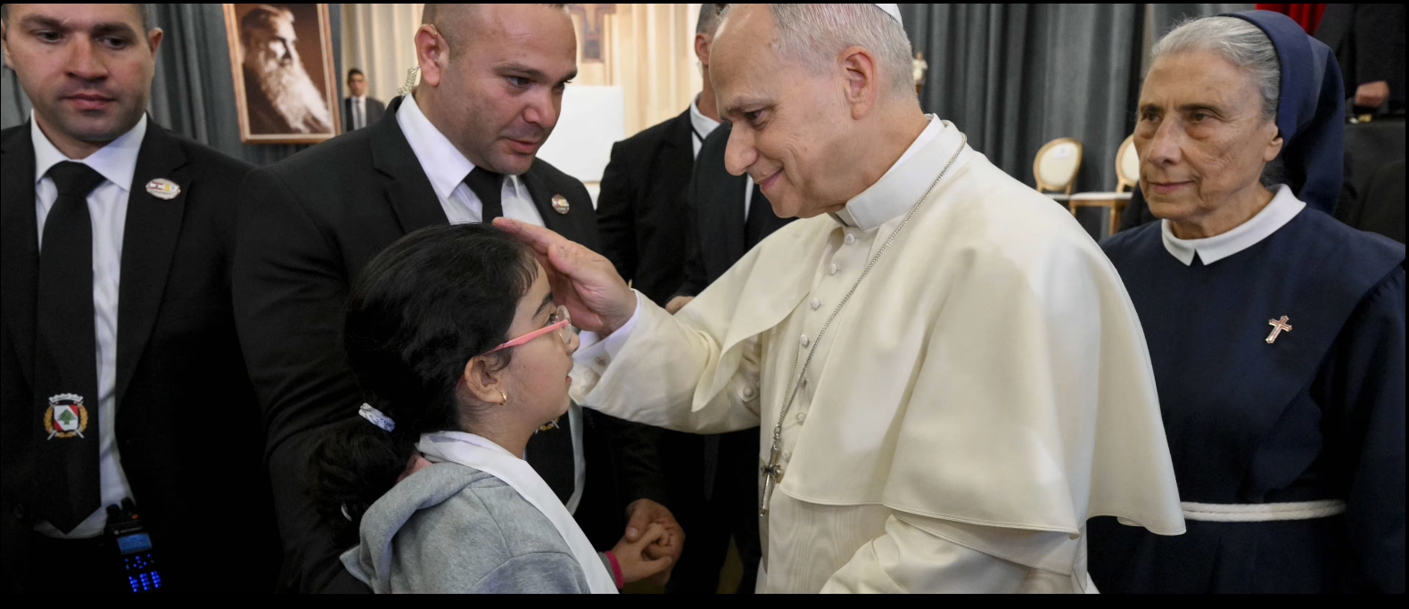Đức Thánh Cha Lêô XIV chúc lành cho một trẻ em tại Bệnh viện De La Croix dành cho người thiểu năng trí tuệ ở Jal el Dib, phía bắc Beirut, Lebanon, vào ngày 2 tháng 12 năm 2025 (Ảnh: Truyền thông Vatican)